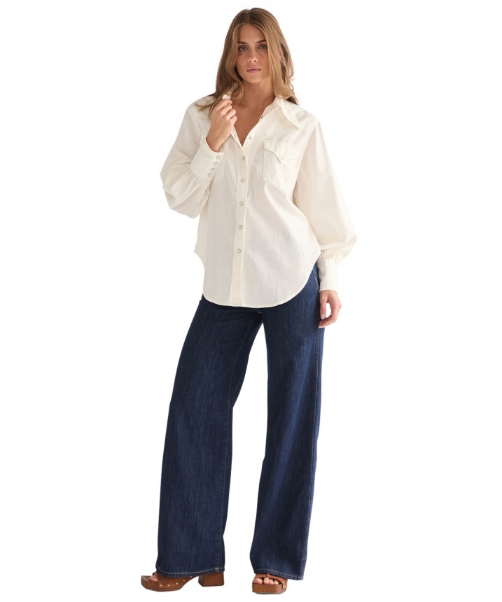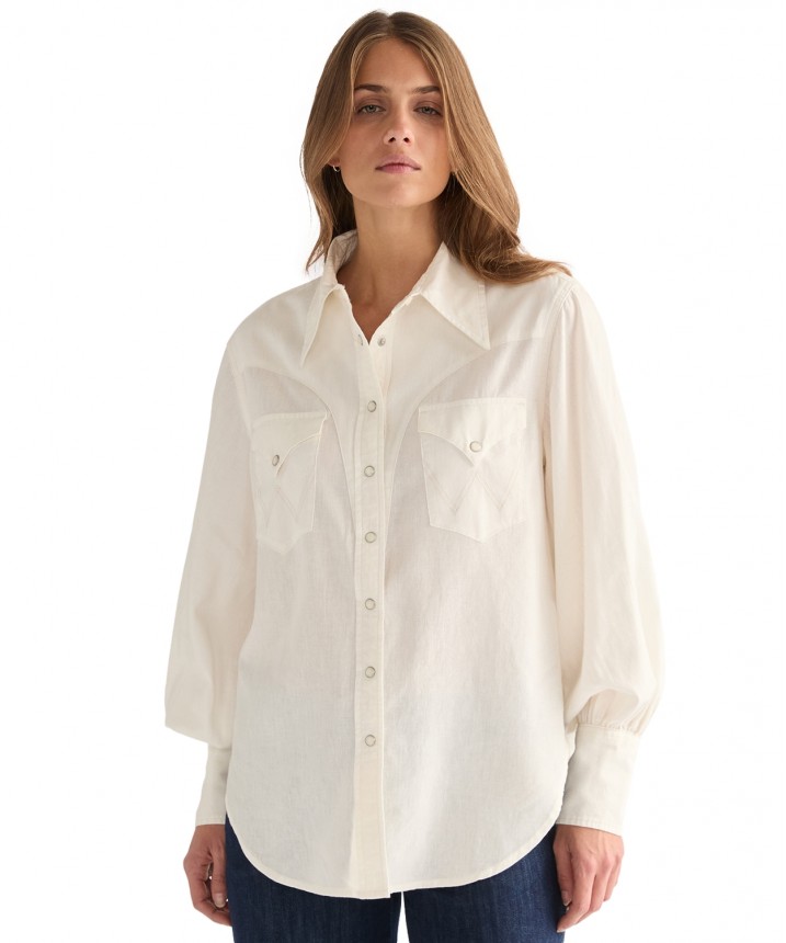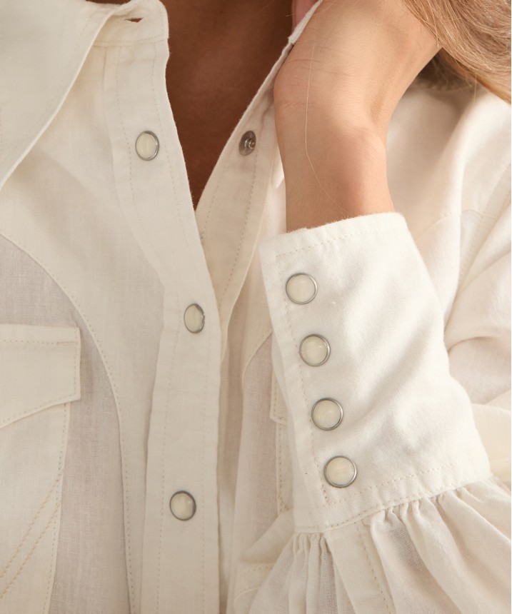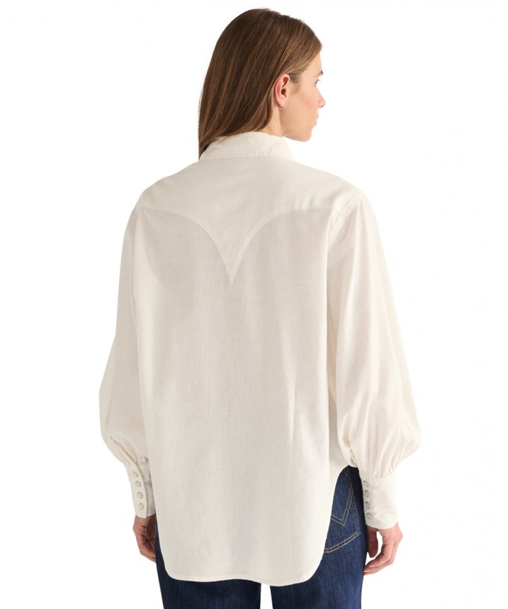 Biała koszula Exaggerated Western z charakterystycznym przeszyciem w kształcie litery W i westernowymi karczkami z przodu i z tyłu to efektowna interpretacja amerykańskiej klasyki. Dzięki charakterystycznemu przeszyciu w kształcie litery W i westernowym karczkom z przodu i z tyłu celebruje wszystko, co kochamy w naszych amerykańskich korzeniach. Lekki materiał jest idealny na cieplejsze miesiące. Krój Relaxed doskonale łączy się z innymi warstwami ubioru. Ten model ma efektowne balonowe rękawy, dwie kieszenie na klatce piersiowej, zapięcie na zatrzaski i logo. Skład: 71% bawełna, 29% len. Grubość materiału: 4 Oz.