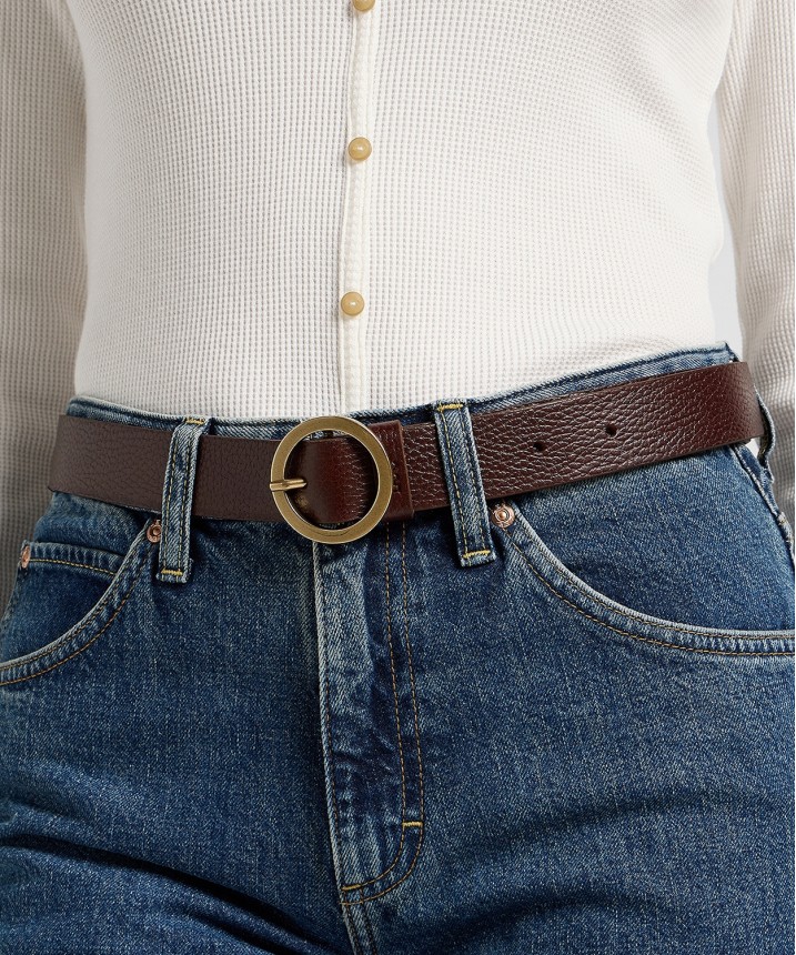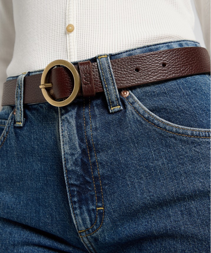 Dodaj szyku swoim jeansowym stylizacjom z naszym damskim paskiem Round Buckle. Ten dodatek z okrągłą metalową klamrą odmieni każdy look - zdecydowanie na lepsze. Wykonany z wysokiej jakości skóry licowej. Wykończenie w odcieniu Dark Brown odpowiada za neutralny look z delikatnym westernowym akcentem. Prosta okrągła klamra w kolorze matowego złota zapewnia klasyczny wygląd. Skład: 100% skóra.