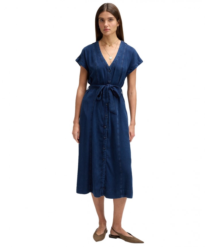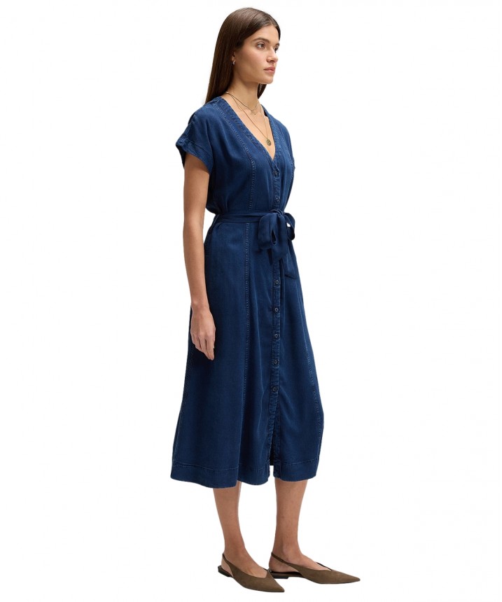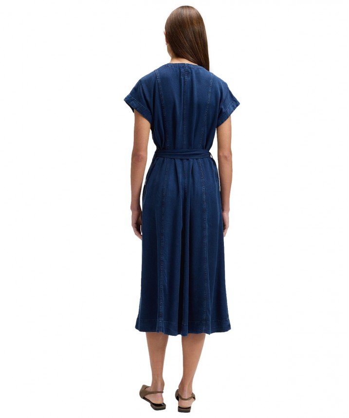 Sukienka midi z paskiem podkreśla sylwetkę i wysmukla w odpowiednich miejscach dzięki panelowemu krojowi w kształcie litery A, krótkim kimonowym rękawom oraz wiązaniu w talii. A ponieważ dokładnie wiemy, czego potrzebujesz, dodaliśmy również kieszenie po bokach. Lekka mieszanka lyocellu i modalu wspaniale się układa i stanowi wyjątkowo miękką alternatywę dla klasycznego dżinsu. Wykończenie w głębokim odcieniu indygo Sunset Ride nadaje całości czysty, nieskomplikowany wygląd. Skład: 64% lyocell, 36% modal. Grubość materiału: 6.5 Oz.