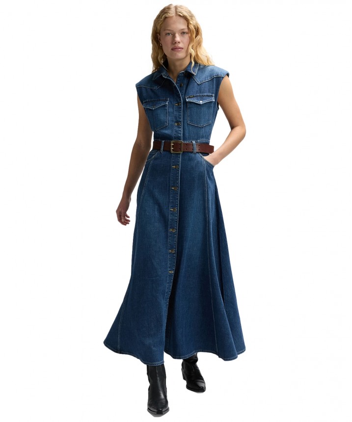 Spiczasty karczek na górze i zwiewna spódnica na dole? Ta sukienka maxi zapinana na guziki na całej długości wzbogaca surową westernową estetykę o kobiece akcenty. Ramiona zawijają się do wewnątrz, aby stworzyć iluzję podszewki. Efekt? Wygląd, który naprawdę przyciąga uwagę. Lekko rozciągliwy denim o gramaturze 262 g/m2 na bazie bawełny z recyklingu zachwyca autentycznym wyglądem, a jednocześnie idealnie się układa. Wykończenie w klasycznym niebieskim odcieniu Dark Magic z przetarciami we wszystkich właściwych miejscach nadaje całości znoszony wygląd. Skład: 89% bawełna, 11% elastomultiester. Grubość materiału: 9.25 Oz.