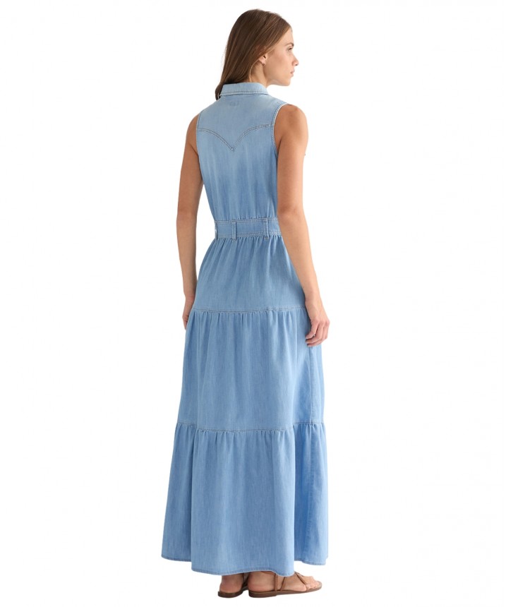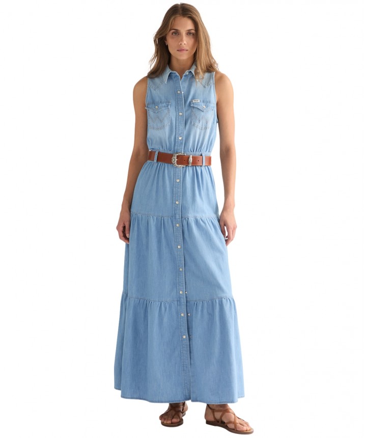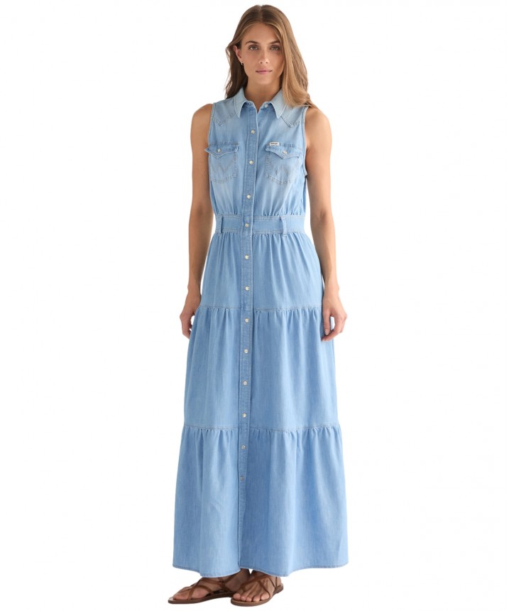 Warstwowa sukienka maxi została uszyta z miękkiego w dotyku materiału i ma westernowy tylny karczek, który nawiązuje do naszego dziedzictwa. Idealny wybór na wiosenne i letnie wyjścia. Warstwowa sukienka maxi ma westernowy tylny karczek, który nawiązuje do naszych korzeni sięgających Amerykańskiego Zachodu. Została uszyta z miękkiego, komfortowego materiału, a dzięki paskowi w talii daje wiele możliwości dopasowania. Regularny krój i korzystna długość maxi. Ten model ma zapięcie na zatrzaski z przodu, pięć szlufek na pasek oraz dwie kieszenie na piersi z charakterystycznym przeszyciem w kształcie litery W. Materiał wykorzystany w tym artykule jest produkowany w co najmniej 20% z bawełny z recyklingu przedkonsumenckiego. Skład: 81% bawełna, 19% poliester. Grubość materiału: 5.8 Oz.