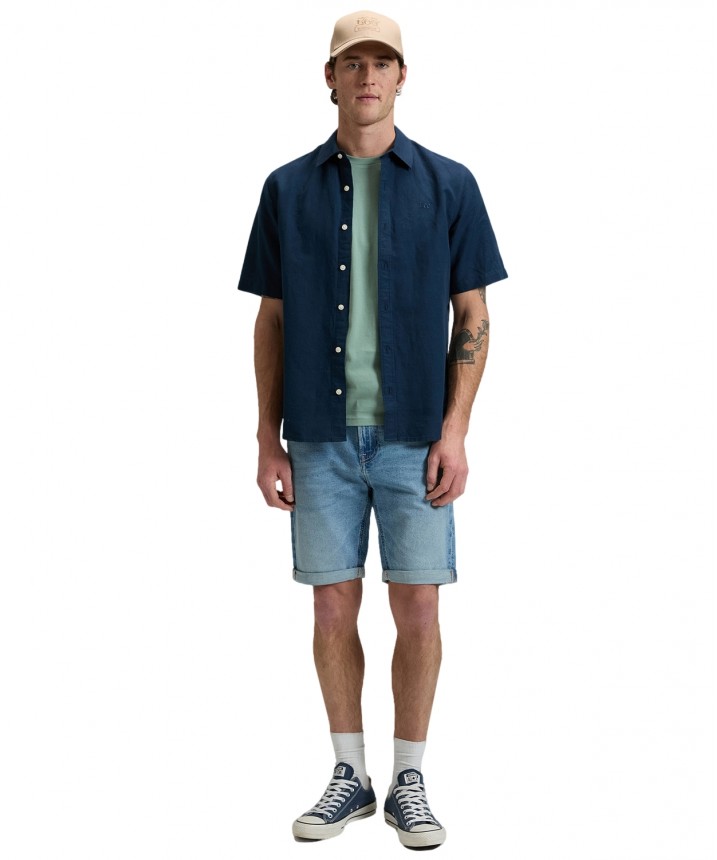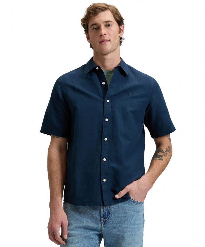 Koszula Lee z krótkim rękawem to prawdziwy letni klasyk. Jest prosta i minimalistyczna - nie ma kieszeni, tylko logo wyszyte tonalną nicią na klatce piersiowej. Materiał zapewnia to, co najlepsze z obu światów, łącząc przyjemną w dotyku bawełnę z przewiewnością lnu. Skład: 55% len, 45% bawełna.
