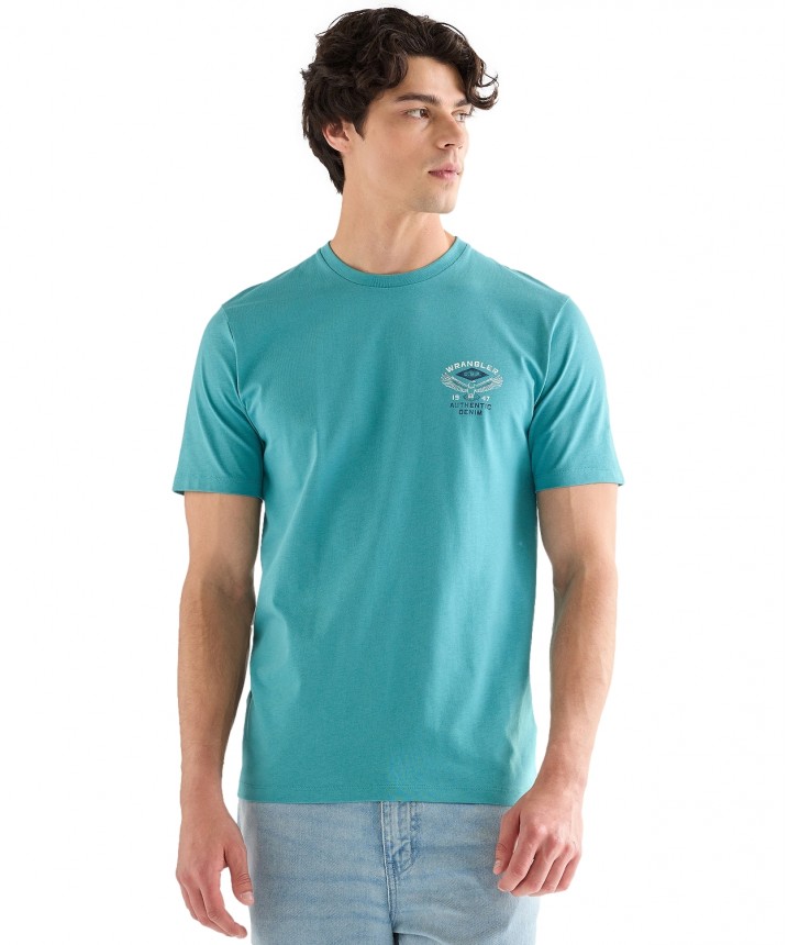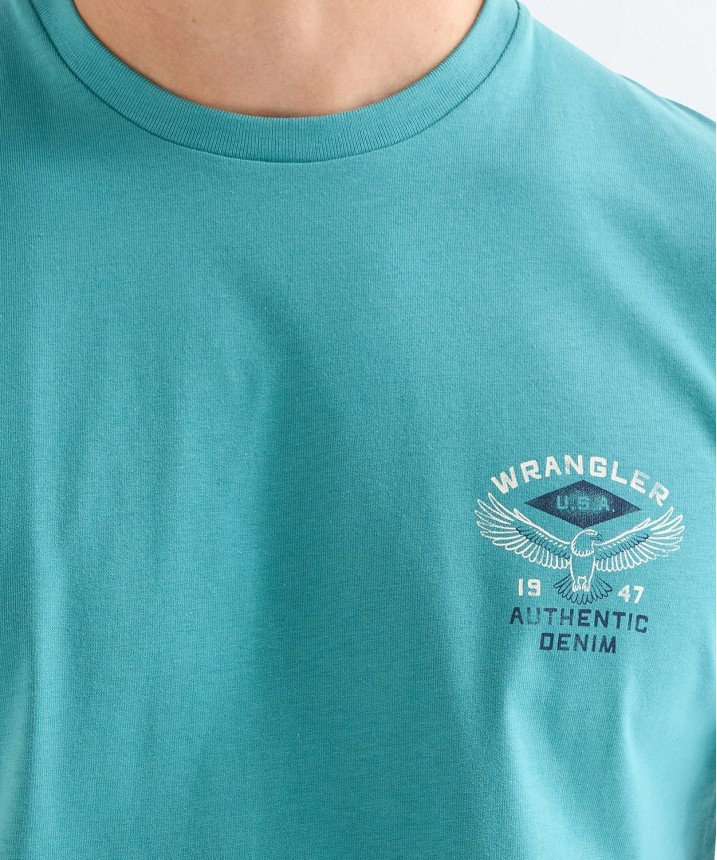krótkie rękawy i nadruk „Wrangler, authentic denim 1947” na lewej