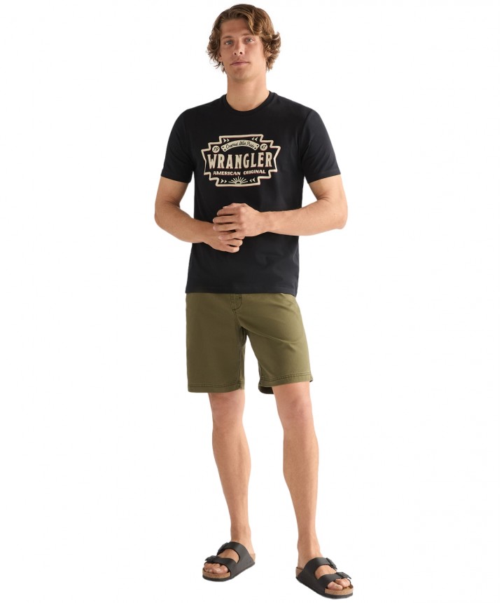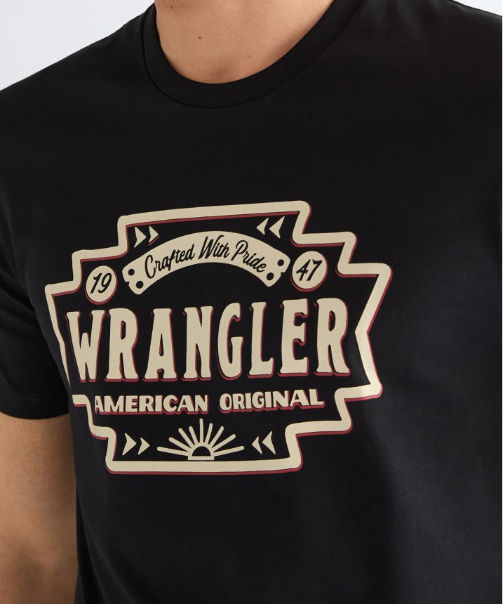 Koszulka Americana to celebracja ponadczasowego stylu, w czarnym kolorze, który jest uniwersalny na każdą porę roku. Krótki rękaw i klasyczny okrągły dekolt sprawiają, że jest to niezbędny element codziennej garderoby. Kultowy nadruk z logo Wrangler na piersi podkreśla dziedzictwo marki. Materiał: 100% bawełna.