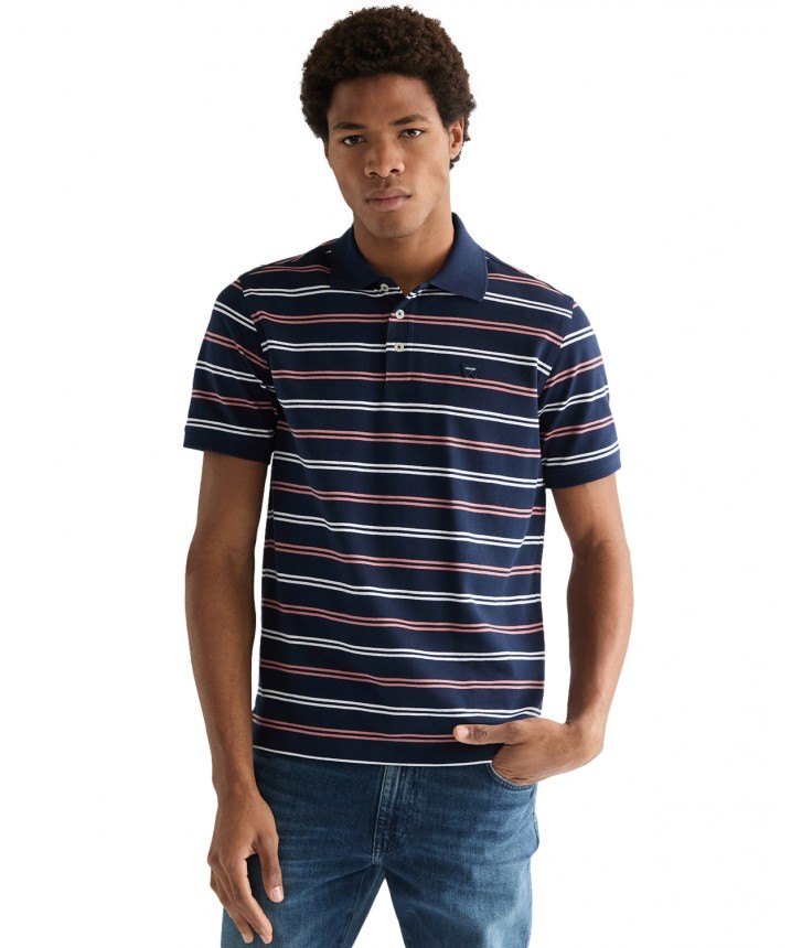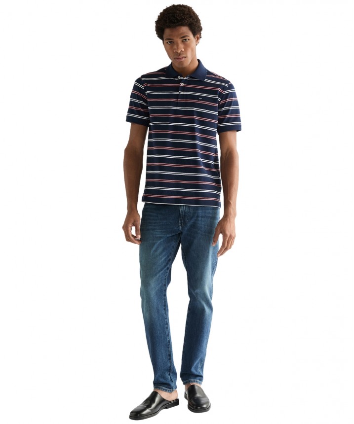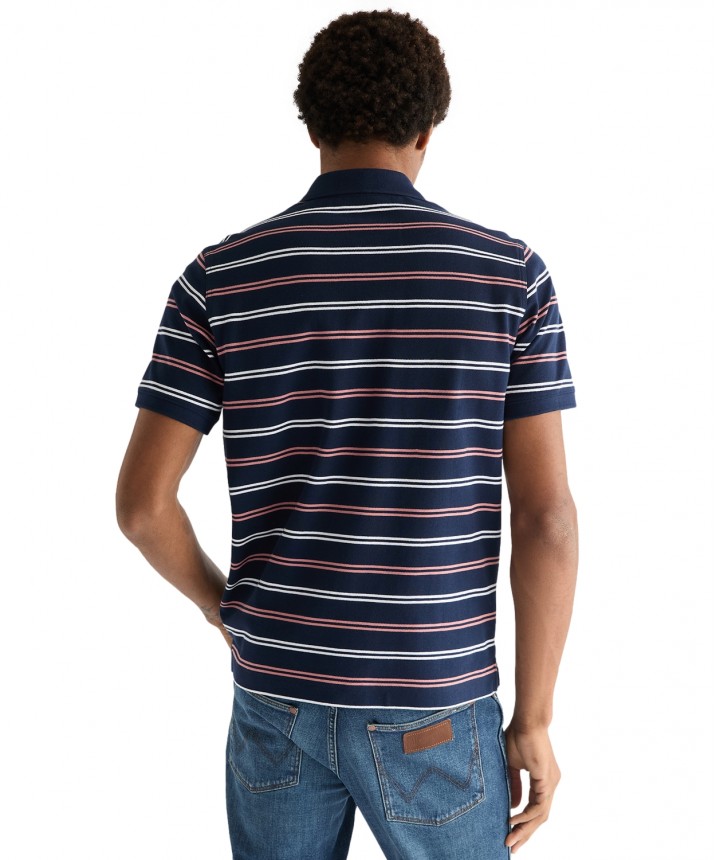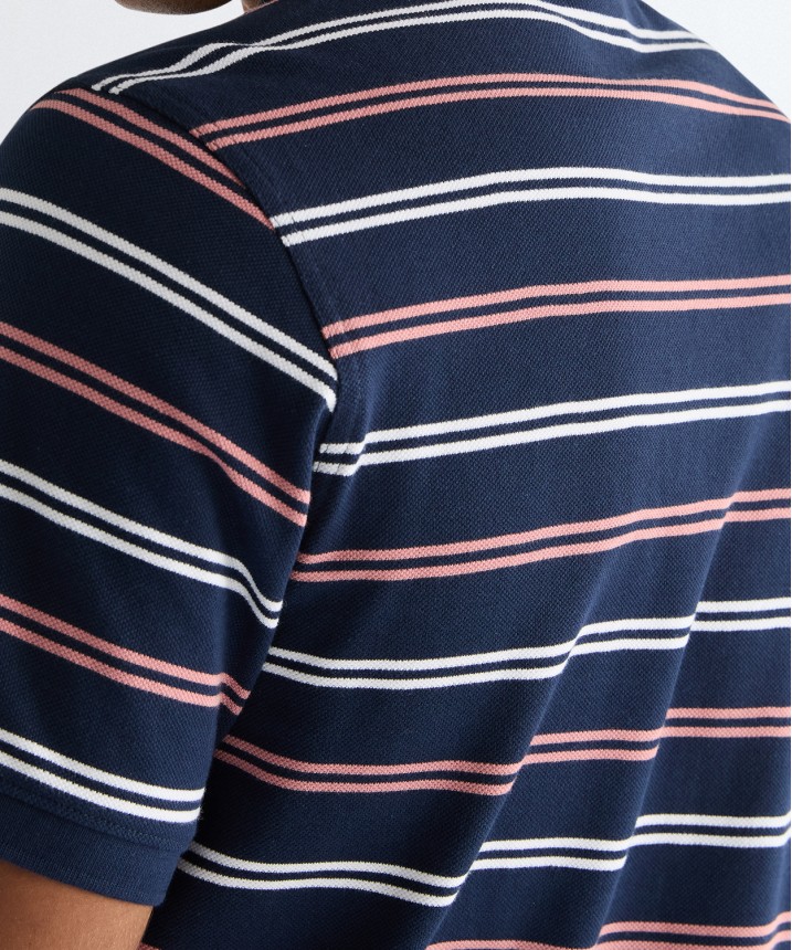 Koszulka polo w paski z bawełny o gramaturze 209 g/m² to praktyczny i niezbędny element garderoby. Jest miękka, przewiewna i idealna na okazje w stylu smart casual. Ta miękka i wszechstronna koszulka polo w paski to praktyczny i niezbędny element garderoby, który doskonale sprawdzi się w stylizacjach smart casual. Materiał o splocie pique jest miękki i oddychający, a zapięcie na trzy guziki nadaje całości klasyczny charakter. Artykuł o wygodnym regularnym kroju uszyty z miękkiej bawełny pique. Całości dopełnia kontrastowy kołnierzyk z prążkowanej dzianiny, prosty dół oraz subtelna naszywka z logo na lewej piersi. Materiał wykorzystany w tym artykule jest produkowany w 100% z bawełny uprawianej w wybranych regionach Afryki, które statystycznie zużywają mniej nawozów i pestycydów niż konwencjonalne uprawy bawełny poza Afryką. Dane oparte na publikacji ICAC World Cotton Data Book.