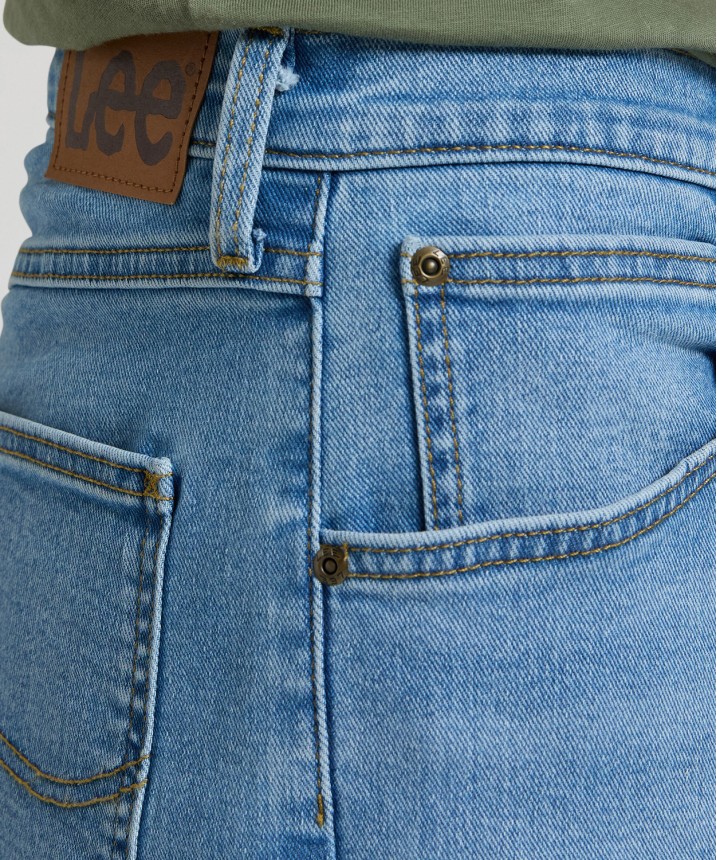 Subtelny akcent w postaci wykończonego dołu sprawia, że te klasyczne spodenki dżinsowe można nosić z nogawkami opuszczonymi lub podwiniętymi. Mają dopasowany krój. Materiał to lekki i niezwykle wygodny dżins wykonany z mieszanki stretchu i bawełny, w tym bawełny pochodzącej z recyklingu odpadów pokonsumenckich. Jest to jasny, wyrazisty niebieski jeans. Skład: 83% bawełna, 13% poliester, 2% elastan. Grubość materiału: 13 Oz.