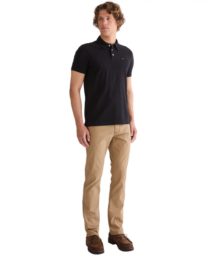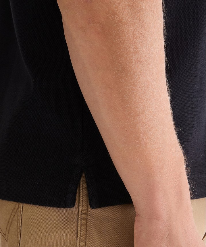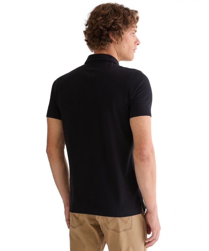 Odkryj ponadczasowy urok czarnej koszulki polo o regularnym kroju, idealnej na każdą porę roku. Koszulka polo z krótkimi rękawami i klasycznym krojem ma zapięcie na trzy guziki i została ozdobiona małym haftowanym logo na lewej piersi. Skład: 100% bawełna.